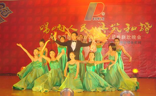 本网讯 欢声笑语辞旧岁,莺歌燕舞迎新年。12281830,由人民电器集团、温州大学瓯江学院和柳市镇长虹村共同举办的《唱响人民·共筑和谐》2008年庆元旦迎新春联欢晚会在集团总部多功能厅隆重举行。正在外地考察工作的郑元豹董事长、叶玉森总经理发来贺电,预祝晚会取得圆满成功,祝愿全体员工新年快乐,万事如意。